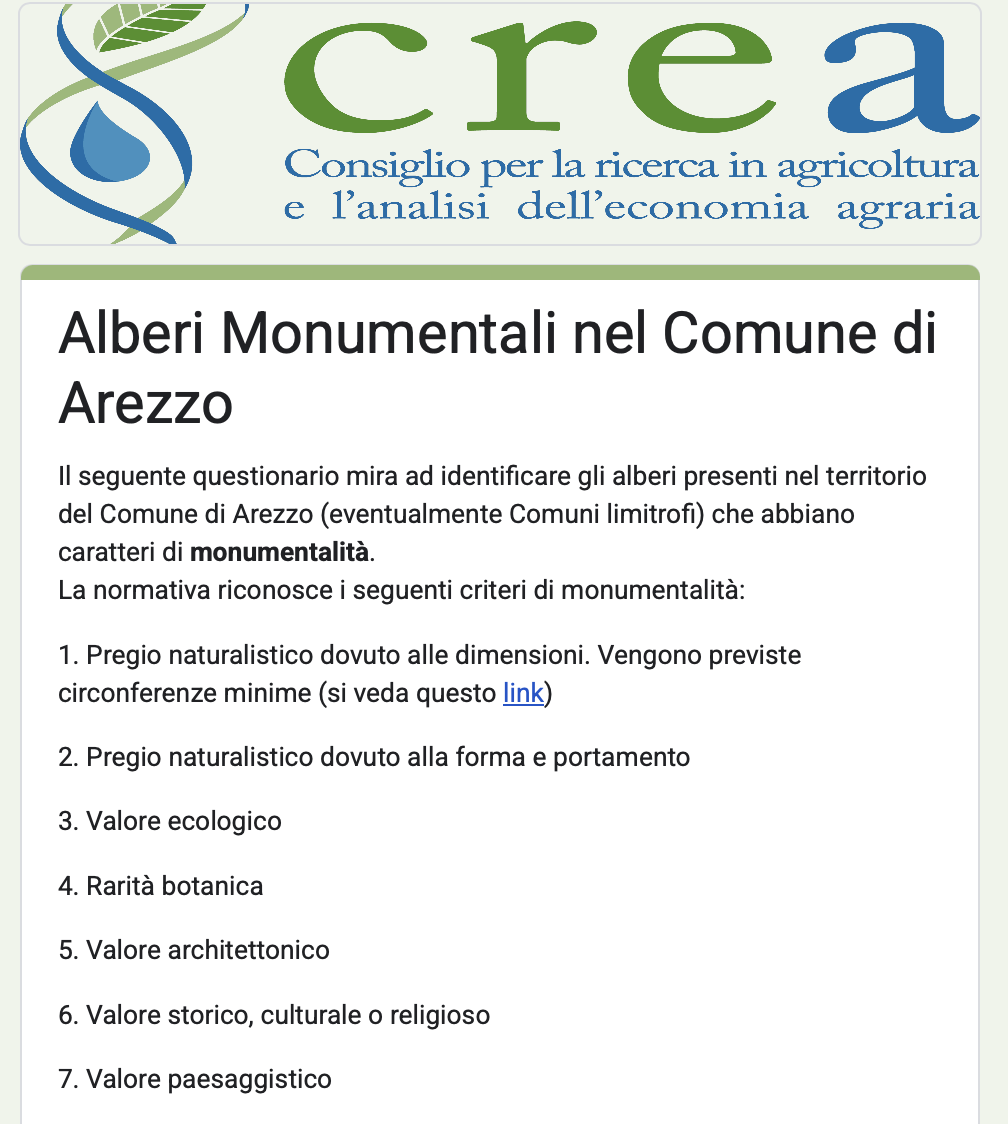 Già durante la mappatura degli alberi di Arezzo, il progetto IDEAr ha identificato alcuni alberi che potrebbero essere inseriti nell’elenco degli alberi monumentali. Per questo motivo, abbiamo deciso di creare un sondaggio per individuare alcuni alberi che per loro caratteristiche possano essere candidati come alberi monumentali.